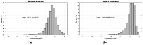 Distribution of required deceleration (300 random vehicles): (a) case of braking start point; (b) case of sailing start point.