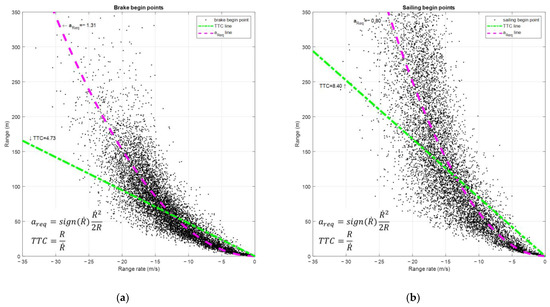 To analyze the reason why the required deceleration is necessary to imitate the driving of human drivers, the distributions of braking/sailing start points are represented with respect to relative distance/velocity (see Figure 8). Human drivers show a similar tendency to trend toward the average value of the required deceleration specified in Table A3 and Table A4. In addition, the time-to-collision (TTC), which is widely used in vehicle risk assessment standards, is approximated near the origin and compared with the specified average required deceleration. As the TTC has a linear relationship with both the relative distance and the relative speed, it cannot adequately represent the driving patterns of human drivers. In other words, to express the characteristics of the sailing and braking start points, the driver model should be an acceleration/deceleration-based model.