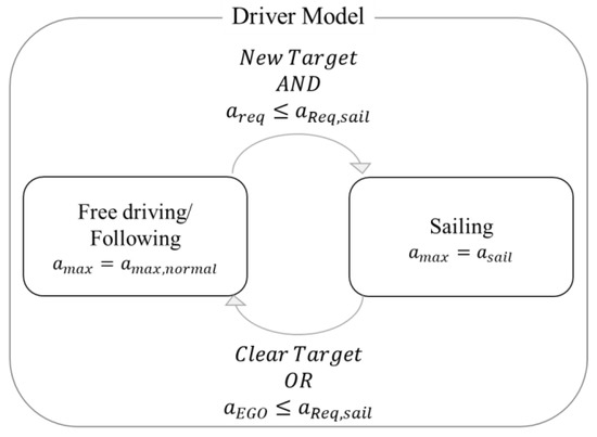 In Section 4.1, Section 4.2 and Section 4.3, parameters expressing the driving characteristics of human drivers are derived. These parameters are the maximum acceleration (), the maximum deceleration or minimum acceleration (), and the deceleration at the sailing start point (). The three parameters are analyzed in terms of the mean and standard deviation in the previous sections. A typical human driver can be regarded as having the mean value of each parameter, and the more atypical the driver is, the further their behavior is from the mean. Therefore, the driving situations of various drivers can be simulated using the parameters derived from the analysis results. This means that atypical scenarios and various human driving patterns can be expressed according to changing parameters, such as the constraint for acceleration/deceleration and the weights of the driver model in the proposed longitudinal motion scenario design method. In other words, it is possible to create various longitudinal scenarios by defining the mode transition conditions of the driver model, as shown in Figure 9, and changing the constraint settings presented in Equation (6) for the required acceleration/deceleration corresponding to each mode.