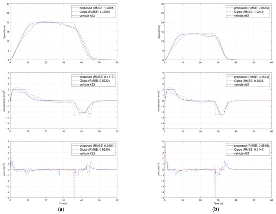 The simulation results are compared with the results imitating the driving data of drivers #23, #57, #61, and #13 of SPMD, and are presented in Figure 10 and Figure 11. The weights of the proposed MPC-based driver model were derived using Equation (12) to show the longitudinal driving pattern most similar to the actual driver’s speed profile. The parameters set in the MPC-based driver model are specified in Table 4. It can be confirmed that the accelerations shown in Table 4 are included in the acceleration range of human drivers derived from Section 4. In these results, the proposed model has mostly lower RMSE than the Gipps model’s, which means that the proposed model shows a more similar driving pattern than the Gipps model. With the simulation results from Figure 10 and Figure 11a, it is shown that the proposed model can simulate both the acceleration and the deceleration of the target driver, as well as the timing and deceleration of the driving speed. However, the Gipps model shows a sudden acceleration/deceleration change that is physically impossible due to the absence of constraints. In other words, the Gipps model shows a large value of jerks when the vehicle starts acceleration and braking. Moreover, the sailing shown by the human driver is not considered in the Gipps model, resulting in differences between the Gipps model predictions and the actual human driver behavior. If the Gipps model is used in the verification of ADAS and ADS, the ADAS and ADS can act abnormally because the Gipps model acts in a manner that is physically impossible in the real world. For this reason, the proposed method can be reasonable in the verification of ADAS and ADS.