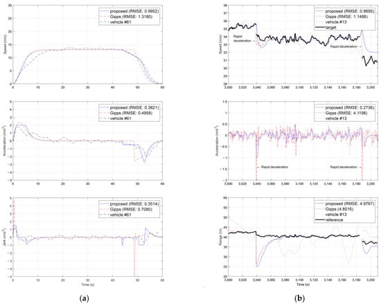The proposed driver model is verified with the presence of multiple lane changes in the SPMD data, which is driver #13’s driving, to confirm the driving reliability in the traffic environment (see Figure 11b). The leading vehicle with a relatively low speed changes into a lane ahead of the ego vehicle at 3040 s and 3190 s. In the case of the proposed model, the change in acceleration is similar to that of driver #13’s driving, and stable driving is achieved for the leading vehicle. However, the Gipps model shows rapid acceleration changes due to the mode transition when a lane change occurs. This shows the same result as the problem shown in Figure 10 and Figure 11a. The RMSE of the proposed method is similar to the Gipps’. This is because the proposed method is assumed with the constant velocity motion of the leading vehicle () for simplification. Moreover, driver #13’s driving is not shown to have the CTG policy to the leading vehicle as the proposed model. However, the proposed model has a similar acceleration tendency as the human driver, despite the presence of the velocity/acceleration of the leading vehicle. If the leading vehicle has a sudden velocity change, the acceleration of the leading vehicle should be considered in the driver model, as mentioned in Section 3.1, for more realistic driving motion.