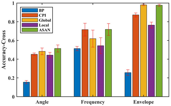In order to confirm that the proposed adaptive sparse attention network is effective in fault diagnosis, various existing intelligent diagnosis methods and related research are compared and analyzed with the proposed method. Among them, in the BP method, the inputs are manual features and angular domain signals, and each layer has 4-10-7 and 3600-60-7 nodes, respectively. In the CPI method, the network structure described in Section 3.2 is used, the attention module is not included, and the convolution parameters of each sequence are independent. In the global method, the network structure described in Section 3.2 is used, but the structure of attention uses global attention. In the local method, the network described in Section 3.2 is also used, but the structure of attention uses local attention, that is, pays close attention to the target sequence’s window area, and the window contains 10 sequences. In the proposed ASAN method, the structure of the network is as shown in Section 3.2. Each method trained the model with angular domain (time domain), spectral, and envelope spectral data containing 10 fault settings under the same 0 hp load condition. As the diagnostic accuracy under the 0 hp load data reached 100%, the cross-working condition diagnosis test was carried out using the data of the 3 hp load, and the average accuracy of 10 cross-working condition diagnoses was calculated, as shown in Figure 7.