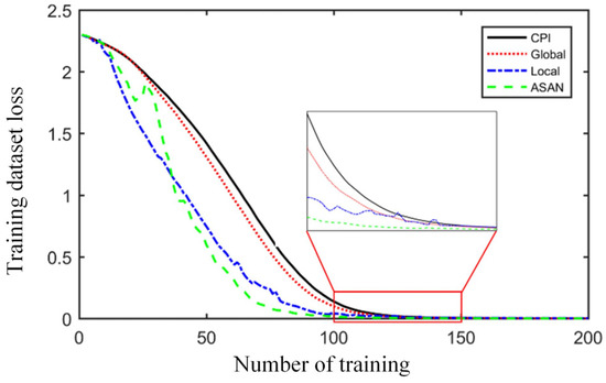In order to further examine the proposed method’s efficacy, this study takes the envelope spectrum data as the input and takes the condition that the loss of the model training set no longer decreases as the model convergence. The convergence time of the CPI, Global, Local, and ASAN methods are counted as depicted in Table 7, and the trend of the training set loss of each method increasing with the epoch is shown in Figure 8.