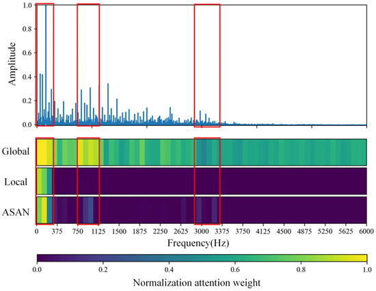 As depicted in Figure 9, the global method mainly pays attention to the frequency around 0–1000 Hz and has second-level attention to the frequency components between 2000–3000 Hz, but the global method also has an attention weight of more than 0.4 for other frequency bands, which the interpretation of the model has a certain adverse effect. Due to the limitation of the window, the Local method can only concentrate on the low-frequency region, especially the 1-times frequency of the working frequency and the fault. After the sparse operation of the network, the ASAN method mainly takes notice of the low-frequency region, around 1000 Hz and 3000 Hz, which has a certain correlation with the attention weights obtained by the global method. However, the ASAN method can greatly suppress the expression of redundant sequences on the premise of ensuring the model’s performance, which can aid in our comprehension and diagnosis of fault signals.