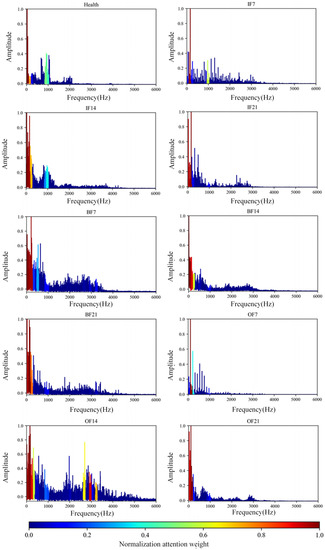 The fault form of the bearing is closely related to its fault characteristic frequency. The low frequency of the bearing fault characteristic frequency is often used in manual diagnosis. However, due to the modulation of the carrier wave, the fault frequency occasionally appears in the high-frequency region, which brings difficulties to manual diagnosis. Therefore, this paper uses sparse attention to further explore the performance of the fault characteristic frequency when the bearing fails. Figure 10 shows the average value of attention weights learned by the model for each bearing dataset working condition sample, and the visual attention weight of each working condition sample is depicted in Figure 11. The size of the attention weights is indicated by their color, and the red indicates the high level.