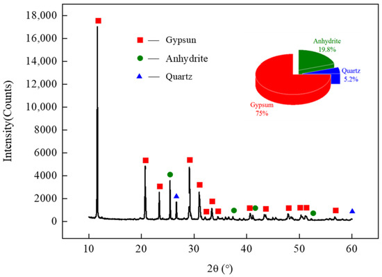 In this study, the original rock of the sample is collected from a tunnel jobsite in Lvliang City, Shanxi Province, China. The tunnel structure has suffered a rock swelling disaster. The destruction of the tunnel is shown in Figure 1. According to the X-ray diffraction analysis, the main mineral composition of the gypsum rock is 75% gypsum, 19.8% anhydrite and 5.2% quartz, as shown in Figure 2.