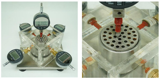 The dial indicators were calibrated before test. After the calibration, water was slowly poured into the container until the upper permeable stone was merged. Within the first hour, the dial indicator data were recorded every 10 min. During the testing period of the remaining 2820 min, the deformation and water immersion time were recorded every 60 min. The water temperature was kept with a variation within ±2.0 °C during the experiment. The water level was also kept stable.