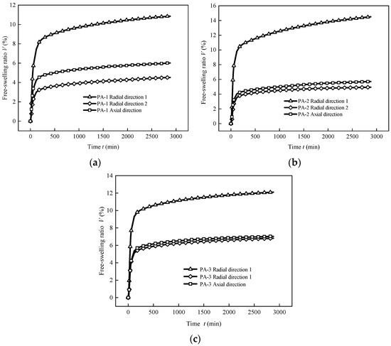 The test results of free-swelling ratio are listed in Table 2 and plotted in Figure 7a–c, respectively. It can be seen from Figure 7a–c that the variations with time of the free-swelling ratios of the three samples are similar. It can be seen from Figure 7a that, during the first 120 min, the free-swelling ratios of the radial direction 1, the radial direction 2 and the axial direction of the samples PA-1, PA-2 and PA-3 all increase rapidly as the immersion time increases. Radial direction 1 represents the sum of the numerical changes in dial indicators 1 and 3, while radial direction 2 represents the other direction. The axial-direction swelling ratio is calculated by dial indicator 5, as shown in Figure 4. After the first 120 min, the free-swelling ratios of radial direction 1, radial direction 2 and the axial direction increase slowly as the immersion time increases. Similar to previous research, the largest value of the free-swelling ratios of radial directions 1 and 2 is defined as the maximum radial free-swelling ratio, which is used to show the free-swelling behavior parallel to the gypsum layer.