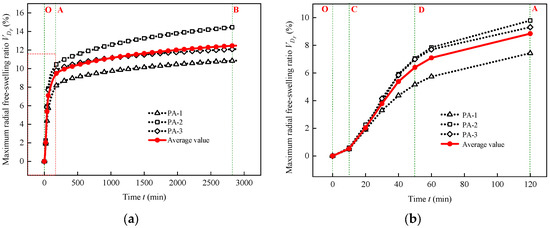 Figure 8 shows the maximum radial free-swelling ratio variation as time increases. It can be seen from Figure 8a that there is an inflection point when the maximum radial free-swelling ratio increases as time increases (t = 120 min in the present study). Before the inflection point, the maximum radial free-swelling ratio increases rapidly with the increase in immersion time. After the inflection point, the maximum radial free-swelling ratio becomes stable as immersion time further increases. The maximum radial free-swelling ratio at the inflection point is about 70.0% of the maximum radial free-swelling ratio at 2880 min.