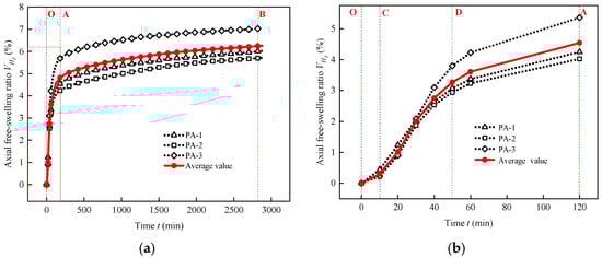 Figure 9a shows the variation in axial free-swelling ratio with time. During the first 120 min, the axial free-swelling ratio increases rapidly with the increase in immersion time. After 120 min, the axial free-swelling ratio increases slowly with the increase in immersion time. The maximum axial free-swelling ratio after immersion for 2880 min reaches 6.26%.