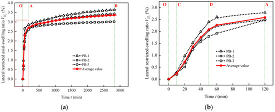Table 4 shows the experimental results of the lateral restricted-swelling ratio test, which were plotted in Figure 10. It can be seen from Figure 10a that, in the initial stage of water immersion, the sample swells and the axial lateral restricted-swelling ratio increases rapidly with the increase in immersion time for the first 120 min. After 120 min, the axial lateral restricted-swelling ratio increases slowly as the immersion time further increases, reaching 3.07% after immersion for 2880 min.