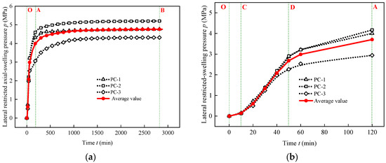 Figure 11b shows the variation in lateral restricted-swelling pressure during the first 120 min. The lateral restricted-swelling pressure shows an S-shaped increase with the increase in immersion time. As immersion time increases, the lateral restricted-swelling pressure increases slowly at first, then increases rapidly, and it finally becomes stable. The swelling pressure reaches 3.71 MPa at the 120th minute, which is 78.1% of the lateral restricted-swelling pressure after immersion for 2880 min. Similar to previous sections, it can also be seen from Table 5 and Figure 11a that the increasing lateral restricted-swelling pressure with time can be divided into two stages. The first stage is the first 120 min of OA segment. During this period, the lateral restricted-swelling pressure grows rapidly. The second stage takes place between the 120th and the 2880th minute of the AB segment. During this period, the lateral restricted-swelling pressure grows rapidly. Under lateral restricted conditions, the swelling pressure shows similar laws to the swelling deformation.