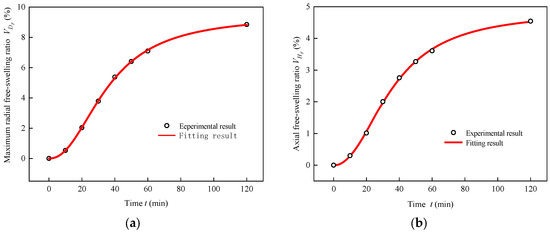 Figure 8b shows the relationship between the maximum radial free-swelling ratio and the time for the first 120 min. It can be seen from Figure 8b that, as immersion time increases, the radial free-swelling ratio increases slowly at first, then rapidly, and then becomes slow again in the final period. The radial free-swelling ratio shows as an S-shaped increase trend with the increase in immersion time. The maximum radial free-swelling ratio reached 8.83% during the first 120 min.