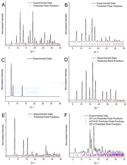 XRD patterns of the MOF coatings obtained using traditional solvents confirming their identities as: (A) HKUST-1; (B) ZIF-8; (C) ZIF-7; (D) ZIF-67; (E) ZIF-14; (F) ZIF-zni; compared against predicted peak position values [27,28].