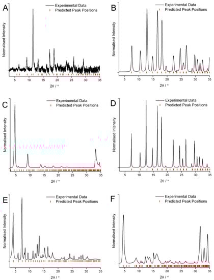 XRD patterns of the MOF coatings obtained using CyreneTM as the solvent for: (A) Cu and BTC; (B) Zn and mIM; (C) Zn and bIM; (D) Co and mIM; (E) Zn and eIM; (F) Zn and IM compared against predicted peak position values [27,28,30,31].