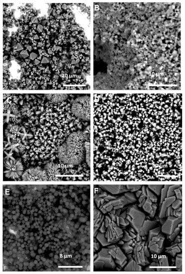 SEM images of the MOF coatings using GVL as the solvent for: (A) Cu and BTC; (B) Zn and mIM; (C) Zn and bIM; (D) Co and mIM; (E) Zn and eIM; (F) Zn and IM.