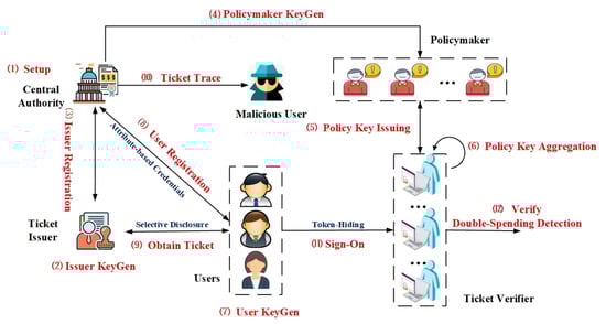 As shown in Figure 1, the architecture of a PriSign scheme consists of five types of parties: a central authority (CA), a ticket issuer (), policymakers (), users (), and ticket verifiers (). The specific role of each party is described below.
