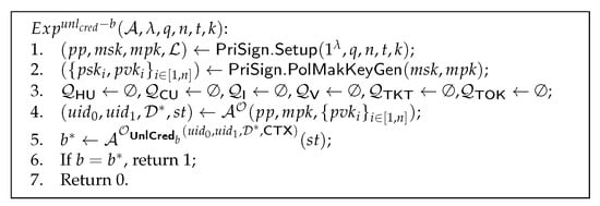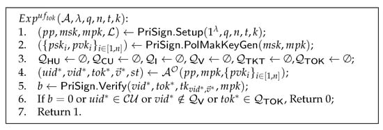 In this section, we adopt a game-based model to define the security properties of the PriSign scheme, including its unforgeability, unlinkability, and token-hiding. All security definitions use the following global variables and oracles. There is a challenger and a PPT adversary in the game; is responsible for initializing the system, issuing keys for all policymakers, and controlling all global variables and oracles; and interacts with through the oracles to break the scheme.