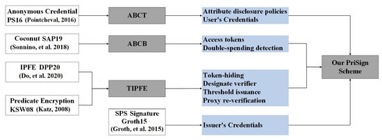 The closest parallel to ASSO is the attribute-based electronic ticket (e-ticket) system [25,26,27]. In such systems, users can buy tickets from issuers using the attribute-based credentials requested from the CA, and then use the tickets to access multiple services. Han et al. [25] first proposed a privacy-preserving e-ticket system, using attribute-based credentials derived from Boneh–Boyen Signature (BBS) [28] and efficient set membership proof and range proof [29]. Next, Feng et al. [26] utilized structure-preserving signatures on equivalence class [30] and dynamically malleable signatures [31] to construct efficient and strong privacy protection in a transferable attribute-based ticket scheme. Shi et al. [27] proposed an electronic ticketing system to address the problem of existing electronic ticketing systems being challenging to deploy in resource-constrained devices and unable to prevent ticket sharing among unauthorized devices. Similar schemes [25,26,27] have achieved user anonymity and fine-grained access control; however, unlike our scheme, none of them support token-hiding and designating verifiers.