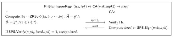 - : This algorithm operates by interacting between I and CA to issue a public key credential for I. I takes as inputs, while CA takes and as inputs. It returns either a credential for I if the execution of the algorithm succeeds, or ⊥ if the execution fails.