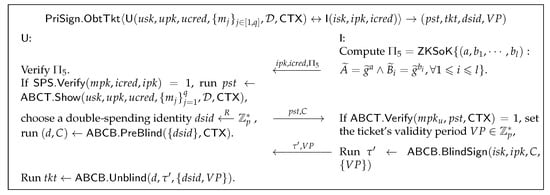 - : This algorithm operates by interacting between U and I to issue a ticket for U. U takes , , , , an attribute disclosure policy (), and a context as inputs, while I takes , , and as inputs. It outputs either a credential presentation , a ticket , the ticket’s double-spending identity , and validity period if the execution of the algorithm succeeds, or if the execution fails, ⊥. Note that should satisfy an attribute disclosure policy generated by I to pass I’s verification, and CTX is a random value to prevent replay attacks.