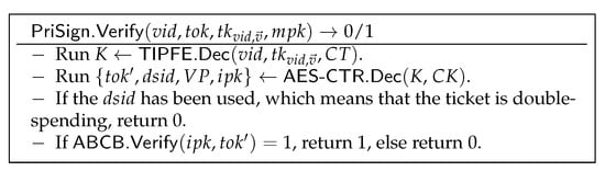 - : This algorithm is operated by a designated verifier V that takes , , , and as inputs. It outputs 1 if the token is validated and not double-spending, and 0 otherwise.