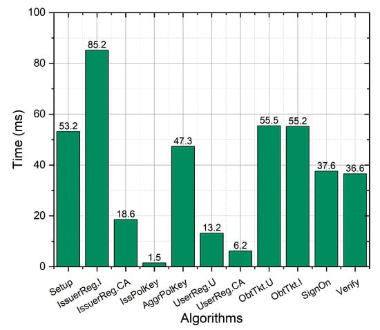 As shown in Figure 13, the Setup algorithm in the PriSign scheme takes 53.2 s. For ticket seller registration, IssuerReg.I and IssuerReg.CA cost 85.2 ms and 18.6 ms, respectively. For policy key generation, IssPolKey and AggrPolKey cost 1.5 ms and 47.3 ms, respectively. For user registration, UserReg.U and UserReg.CA cost 13.2 ms and 6.2 ms, respectively. The most frequently used PriSign algorithms are ObtTkt, SignOn, and Verify. When obtaining a ticket, ObtTkt.U and ObtTkt.I cost 55.5 ms and 55.2 ms, respectively, while when accessing the service, SignOn and Verify cost 37.6 ms and 36.6 ms, respectively. The algorithm that consumes the most time is IssuerReg.I, which takes 85.2 ms; fortunately, it only needs to be executed once for each new issuer. In the algorithm for obtaining tickets, the time required by the user and the issuer is similar, at about 55 ms, while in the sign-on algorithm the time consumed by the user and the verifier is about 37 ms. The above conclusions are consistent with the results in Table 4. In practice, this millisecond time consumption is very friendly to both users and the server.