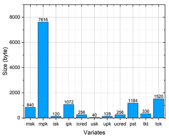 As shown in Figure 14, for the CA, the storage of private key and public parameters in the PriSign scheme takes 840 bytes and 7616 bytes, respectively. For the issuer, the storage of the private key , public key , and credential takes 120 bytes, 1072 bytes, and 256 bytes, respectively. For the user, the storage of the private key , public key , and credential takes 40 bytes, 128 bytes, and 256 bytes, respectively. For obtaining tickets, the storage of the presentation and ticket takes 1184 bytes and 336 bytes, respectively. For the sign-on protocol, the storage of the token takes 1520 bytes. We note that all storage consumption values are byte scale, which is not a burden on the users or the server.