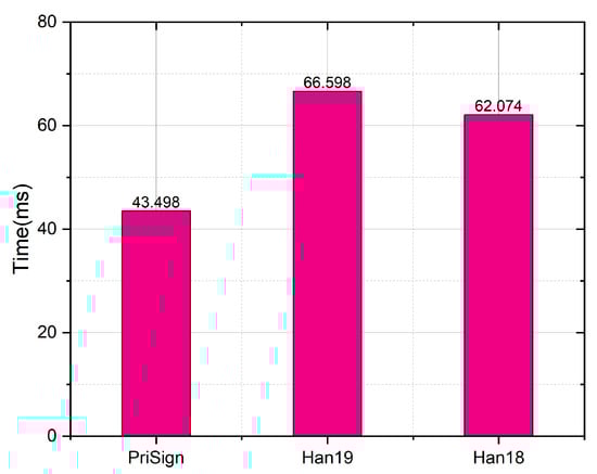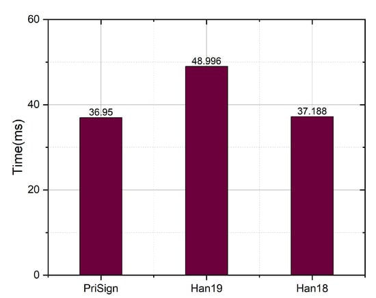 As shown in Figure 18, we compared the Verify algorithm in our system with the systems in [8,9]. The computational overheads are 59.3 ms, 29.1 ms, and 38.7 ms, respectively, for our system and the systems in [8,9]. Although our system has a higher computational cost due to its support for token-hiding, the execution efficiency is nonetheless at the same level as the systems in [8,9], making it suitable for real-world applications.