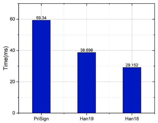 As shown in Figure 15, we compared the ObtTkt.U algorithm in our system to the systems in [8,9]. The computational overheads are 43.4 ms, 62.1 ms, and 65.5 ms, respectively, for our system and the systems in [8,9]. Our system is 30% faster than the system in [8] and 33.8% faster than the system in [9].