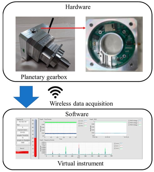 This study increases the robustness of gearbox systems in industrial applications. A planetary gearbox, an embedded sensor and a virtual instrument (as shown in Figure 1) are used to log the operating signal for mechanical parts. Considering the application limitations of installation, system integration and signal accuracy, this study constructs a verification test rig and artificially seeded faulty sun, planetary and ring gears to construct a frequency spectrum using the results of previous studies [15,16,17,18,19,20,21,22,23,24].