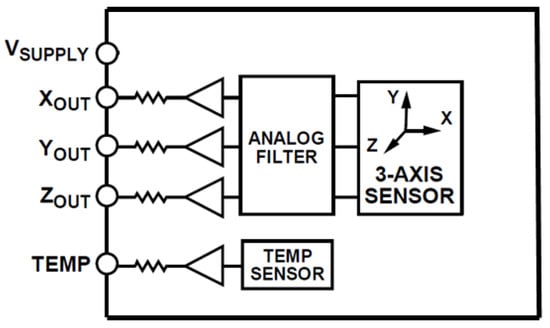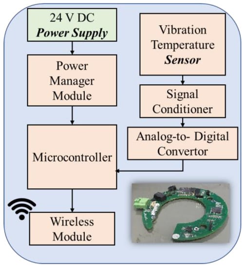The measurement system for this study measures the three-axis vibration and gearbox temperature signals and sends these signals to a user’s device by wireless communication. Figure 3 shows the general block diagram for the measurement system.