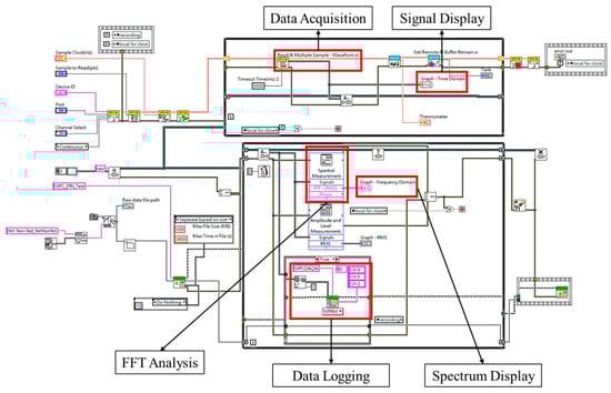 A section of the VI main program is shown in Figure 6. Each module or icon in the diagram represents a function, such as data acquisition, signal display, spectrum display, Fourier transform analysis, calculation of root mean square values and data logging.