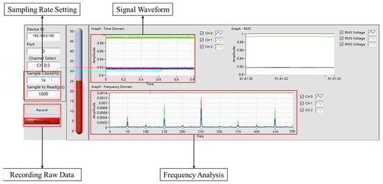 The VI must offer an explicit graphical user interface that allows an observer to efficiently communicate with the gear monitoring system. Figure 7 shows the graphical user interface. Depending on the frequency of the signal, anti-aliasing and sampling rates for different gear operation modes are adjusted. The waveform display window in the upper middle left part of the menu shows the time domain for real-time gear signals. The frequency display window at the bottom center of the menu shows the spectrum of the real-time response signal from the Fourier transform analysis. The remaining functions of the menu include a real-time temperature display, and a data logging trigger, which is clicked one time to start recording the raw data and once to stop recording.