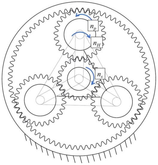 To address the problems of traditional sideband-related indicators, this study uses a typical planetary gear train. An illustrative configuration is shown in Figure 10. For a planetary gearbox, the ring gear is a fixed part, and the planet carrier and the planet gears are integrated together. In this study, r, p, s and H denote the ring gear, the planet gear, the sun gear and the planet carrier, respectively; N is the rotational speed; z is the number of gear teeth; and K is the number of planetary gears.