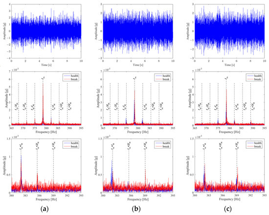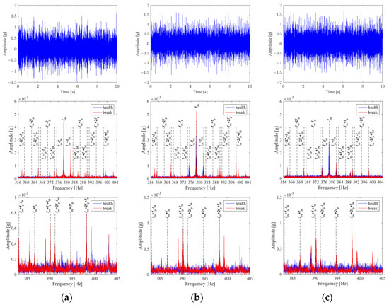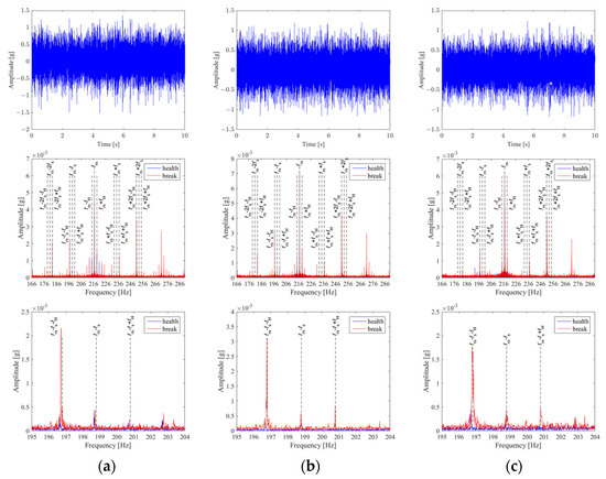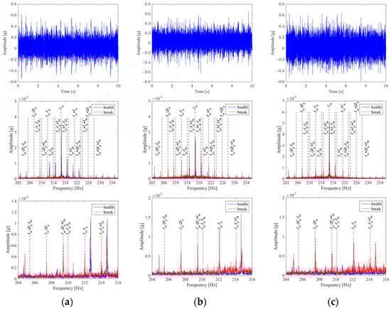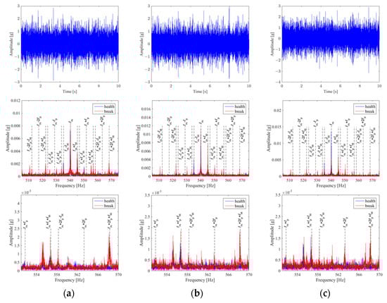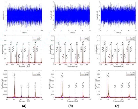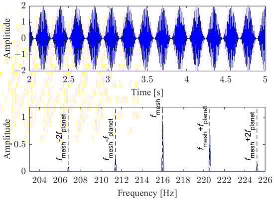 The vibration signal for ring gear wear has different frequency domain spectra, as shown in Figure 26, Figure 27 and Figure 28. The spectral peaks occur at the same frequencies of (where ) as those for the health signal. In the enlarged Fourier spectrum for the wear signal, the sidebands at the frequencies of (where ) have significantly larger amplitudes than those for the health signal, so the gearbox is faulty at the ring gear.