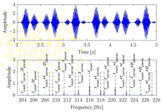 McFadden and Smith [15], McNames [16] and Mosher [17] determined that the involute kinematics of planetary gearboxes produce complex and asymmetric sidebands in the vibration spectrum, which is in agreement with the results of another study [18]. Previous studies [15,16,17,18] did not simulate signals considering the effect of frequency modulation (FM). Inalpolat and Kahraman [19,20] developed a mathematical model to determine the effect of amplitude modulation (AM) and frequency modulation (FM) due to the rotation of the planet carrier and gear manufacturing errors in a dynamic model of a planetary gearbox, and they determined the sideband characteristics around meshing frequency harmonics. This improved dynamic model better predicted the sidebands in planetary gearboxes due to distributed gear errors.