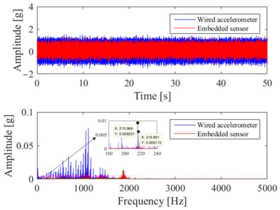 Waveform and Fourier spectrum signal for a wired accelerometer and an embedded sensor.