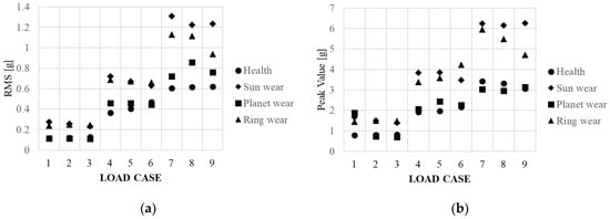 Time domain for wear gear for different load cases: (a) root mean square (RMS); (b) peak value.
