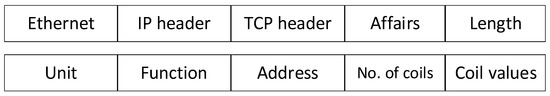 f is an abstract function, the specific implementation depends on the type of industrial control protocol. u represents the specific industrial control protocol, l represents the length of the data packet, t represents the function of the protocol, and m represents the information carried by the protocol. The more information there is, the more patterns are abstracted, resulting in a large difference in the pattern sequence of the same device in different time periods, which cannot be recognized. On the contrary, if the selected information is less, the pattern sequence between different devices will be more similar, causing device confusion. Therefore, characteristic fields with high identification and few changes in the protocol are usually selected. For example, Modbus is a data communication protocol that is based on a request-response model, and is used for transmitting information between devices that are connected to buses or networks over serial lines or Ethernet. The format of Modbus protocol is illustrated in Figure 1. This paper adopts MAC layer, IP layer, TCP layer, transaction, function code, unit, and address information instead of coil value information, because the coil value has a high rate of change and is not suitable for abstraction.