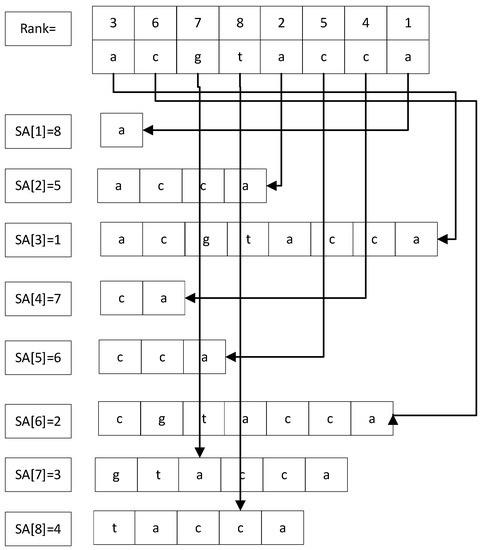 The SA array and the RK array have a reciprocal relationship, that is, , as shown in Figure 3. The time complexity of suffix array-based matching is relatively low, and can be roughly divided into three categories: multiplication algorithm, induced copy algorithm and divide and conquer recursive algorithm. The average time complexity of the multiplication algorithm is , but the space overhead is large, and the order of prefixes needs to be stored. The induced copy algorithm first sorts the selected suffixes according to certain rules, and then induces sorting of all suffixes through the sorted suffixes. The disadvantage is that the time complexity of the algorithm is unstable, which is related to the selected suffixes. The divide-and-conquer recursive algorithm first selects a part of the subsequences, arranges them linearly, then renames the shortened pattern sequence to obtain a new pattern sequence, and then recursively arranges the new shortened pattern sequence until the selected subsequences are arranged. Finally, the unselected subsequences are sorted according to the selected subsequences to generate a suffix array. In this paper, the SA-IS algorithm is used to generate the suffix array.