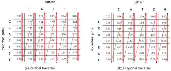 In this paper, the diagonal jump algorithm is adopted to avoid unnecessary cell value calculation. Different from the vertical traversal shown in Figure 6a, the edit distance matrix is updated using the diagonal traversal shown in Figure 6b.