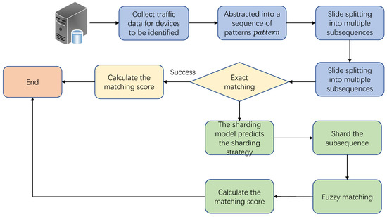 Because the exact matching conditions are strict, the query sequence may not match any device fingerprint, so fuzzy pattern matching will be used for the final device identification. For device fingerprint Finger, query pattern sequence q, and allowable error threshold , fuzzy pattern matching is to find all subsequences satisfying ≤ , where sim is Similarity function, where 1 ≤ i, j ≤ n, is the original sequence corresponding to the device fingerprint. The process of fuzzy matching is shown in the Figure 5. The sequence is first preprocessed to shard it into multi-segment subsequences, and then the multi-segment subsequences are accurately matched, and the error values between the matching sequence and the original sequence are counted. If the error value is higher than a certain threshold, it is directly judged that the matching failed, otherwise its matching score is calculated for the judgment of the final device. This section, we will first outline the overall process of fuzzy matching, then optimize the two processes of fragmentation and computing errors, and finally describe how to calculate the matching score of fuzzy matching.