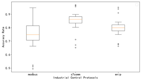 In fuzzy pattern matching, original sequence sharding, uniform sharding and optimal sharding are required. Uniform sharding has high efficiency, but the accuracy is not as good as optimal sharding. Reasonable selection of sharding algorithm can greatly optimize the time cost of matching. Therefore, this paper trains the SVM model for each device fingerprint to predict the fragmentation method of the query sequence. Figure 11 depicts boxplots of accuracy for building predictive models for different fingerprints under different industrial control protocols. For the Modbus protocol, most of the prediction accuracy is between 0.75 and 0.85, and a few prediction model accuracy is between 0.5 and 0.6. The model performs well on the s7comm protocol, with prediction accuracy between 0.85 and 0.9, and a few models with prediction accuracy between 0.65 and 0.75. The average precision of the prediction model based on the enip protocol component is about 0.8, the fluctuation is small and the outliers are close to the average. Therefore, building a fragmentation prediction model can effectively predict the fragmentation algorithm and save time overhead for subsequent fuzzy matching.