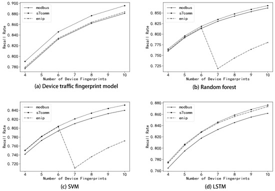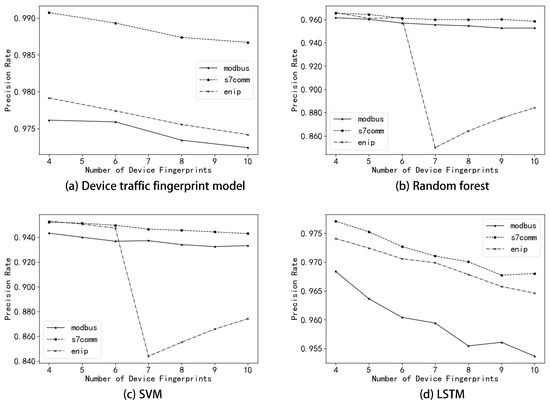 Figure 12 describes the relationship between the recognition accuracy of each model and the number of devices in different industrial control protocols. Accuracy refers to the ratio of the number of correctly classified samples to the total number of samples. Figure 12a shows that the device traffic fingerprint model has the highest recognition accuracy. The highest accuracy rate is about 0.99, and the lowest accuracy rate is about 0.97. As the number of device fingerprints increases, the accuracy rate tends to decrease. Figure 12b,c are graphs of random forest and SVM models, respectively. Overall, the accuracy of random forest is slightly higher than that of SVM, but the accuracy of both models drops off a cliff when the number of devices is 7. Because the device configurations in the same industrial system are similar, the newly added device has almost the same characteristics as a previous device, so the trained model recognizes both devices as one, resulting in a drop in accuracy. When the number of device fingerprints is greater than 7, the accuracy rate is slightly improved, because the recognition accuracy of the newly added device is relatively high, which reduces the impact on the identification confusion of the two devices. Figure 12d is a graph of the LSTM model. The recognition effect is relatively stable, but the accuracy is slightly worse than that of the device traffic fingerprint model. There is a large amount of noise in the actual industrial system, which will affect the recognition of the LSTM model.