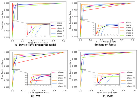 Figure 15 depicts the ROC plots for the four models under the four devices. The abscissa is fpr, which indicates the proportion of samples that are predicted to be positive, but actually negative to all negative samples. The ordinate is tpr, which indicates the proportion of samples that are predicted to be positive and actually positive to all positive samples. The ROC curve combines the true positive rate and the false positive rate, which can accurately reflect the impact of any threshold on the generalization performance of the model, and help to choose the best threshold. The point on the ROC curve closest to the upper left corner is the best threshold with the least classification error, and the total number of false positives and false negatives is the least. The larger the area under the ROC curve, the better the performance of the model. From Figure 15a, it can be seen that the four ROC curves of the device fingerprint model are all close to the upper left corner, the highest area value is 1.00, the lowest is 0.94, and the comprehensive area value is 0.98. The performance of the random forest model and the SVM model is slightly worse, with the comprehensive area values of 0.94 and 0.92, respectively. The LSTM model still shows good performance, the highest area value is 0.97, the lowest is 0.96, and the comprehensive area value is 0.97, which is very close to the recognition effect of the device fingerprint model.
