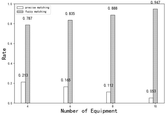 As mentioned above, because there is a lot of noise in the industrial control system, the exact match is often not hit, and in the case of no hit, the fuzzy matching method is used for further identification. Figure 16 counts the number of exact matching and fuzzy matching used by device fingerprint model recognition devices. The highest proportion of exact matching in device identification is 0.213, and the lowest proportion is 0.0513, indicating that in most of the device identification process, precise matching cannot be a good hit, the fuzzy matching algorithm must be used for the final identification. Therefore, although the function of the device is stable, and the data packets sent and received are also periodic, the periodicity is not stable, and there are changes in different time periods. Therefore, it is not realistic to completely extract or match the periodicity. The matching proposed in this paper, which allows a certain fault tolerance, has better performance in practical systems.