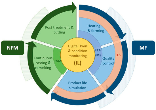 The MUL 4.0 project progressing at the Montanuniversität Leoben, in the form of a comprehensive SPL, encompasses parts of the holistic value chain. This value chain covers multiple technically different and geographically separated production sites, which are connected via a production network in order to transparently gather, store, and share data for analysis purposes. The starting point of the value chain, as depicted in Figure 2, is the Chair of Nonferrous Metallury (NFM), which specifically deals with aluminum alloys and has a miniature continuous casting facility. It enables the casting of a wide variety of common and newly developed alloys, as well as recycled material. This provides the feedstock for the Chair of Metal Forming (MF), where it is delivered. From here it can be further processed in a variety of methods both cold, or annealed to a specific temperature in a digitized industrial furnace. One possibility would be rolling in a miniature rolling mill that has been transformed into a CPPS. A black box machine learning approach allows rolling from a certain thickness to the desired final thickness in multiple passes, specifying the optimal pass schedule [32]. Another option would be forging in a hydraulic press capable of forces up to 1 MN. This press is being transformed into a fully integrated CPPS and is capable of recording data such as forces and temperature during upsetting, and automatically transferring them to a Supervisory Control and Data Acquisition (SCADA) system. The data is pre-processed and transmitted to a higher-level tracking system. Based on the raw material, this system can assign the process data to the respective product and provide information about the respective location. This data is additionally used throughout the value chain for input parameters for the FEA, in order to virtually represent the effects of the process conditions on the final product, and thus serve as a QC tool. Finally, the generated product can be heat treated to adjust the optimal material properties and then be machined to the final product. The value chain introduced here is illustrated in Figure 2.