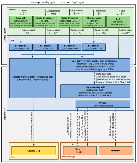 The application of the LUS in the SPL is intended to provide a fundamental contribution to the creation of a DT. This consists of a FEA for the respectively considered heating or forming process of the specimen with microstructural information prevailing in the material. As already mentioned, the description of the microstructural behavior requires a large number of material parameters in order to be able to calculate various material responses as a function of strain, strain rate, and temperature, by means of a microstructure model. Therefore, the coupling of a LUS system with a TMTS, which records these characteristic values of the deformation as well as the corresponding time, is inevitable. This coupling enables the acquisition of data of the forming process via the TMTS Gleeble 3800, as well as in-situ data of the microstructural processes by a trigger signal from the same time and its correlation. Although the LUS system only provides information on the velocity and attenuation of the ultrasonic waves, these can be automatically transferred to various microstructural changes using programmed evaluation routines, as exemplified in Section 4. This makes it possible to obtain information about grain size, recrystallization behavior, or phase transformations during the experiment. Based on the corresponding recording of the flow curve and the flow behavior, a microstructural change from the LUS data can be assigned to the corresponding flow curve parameters. For data acquisition from the LUS, a high-frequency Data Aqusition System (DAQ) will be implemented and integrated into the IIoT network, which can record the analog signals from the LUS, at a sufficiently high frequency to ensure high-resolution signal mapping. For this purpose, the fiber optic based ibaPADU-4-AI-I with ibaFOB-Dexp, in combination with the ibaRackline SAS was chosen, which has measurement frequencies of up to 10 kHz with a resolution of 16bit, and thus fulfills the minimum sampling rate of 400 Hz set by the LUS. Since this DAQ has only four analog inputs, which are already occupied by Gleeble sensors, an identical ibaPADU-4-AI-I is implemented in a parallel synchronous operation, which is combined on the iba processing unit ibaRackline SAS and the software iba PDA & iba Analyzer. For improved traceability of the data recording, the Hierarchical Data Format (HDF) HDF5 is implemented here to record the metadata of each data set, and thus to get a more holistic insight into each measurement. These datasets are automatically synchronized by an open-source approach using Python, on a file server shared with the production network at the MF, in its Data processing layer and consequently stored in the production network’s relational open-source MySQL MariaDB database. This approach is visualized in Figure 3.