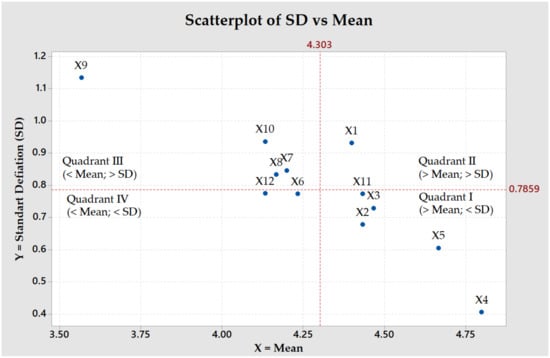 To facilitate the evaluation based on the order of the most influential variables, mapping was carried out in a diagram. Based on Figure 2, each research variable was divided into four quadrants based on the mean and standard deviation.